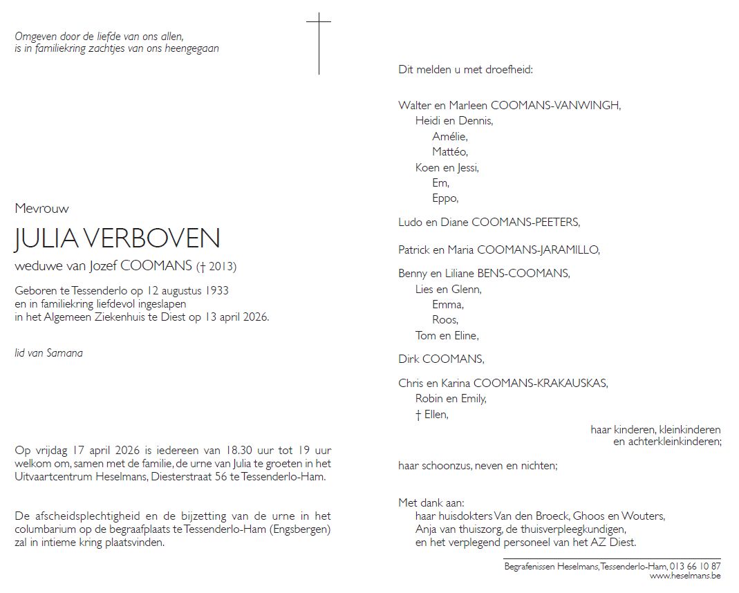 15/04/2026 Gert Beets Overlijden Verboven Julia. Hierbij melden we het overlijden van de (schoon)moeder van onze juryleden, eveneens atleten, Liliane Coomans en Benny Bens. Wij wensen de familie veel sterkte bij dit grote verlies.